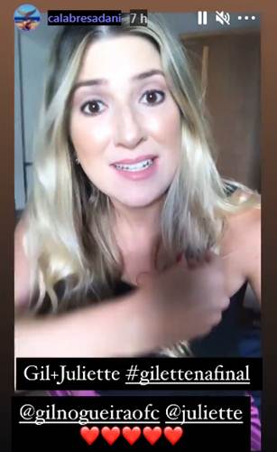 Dani Calabresa usou o stories do Instagram para declarar sua torcida. “Eu poderia estar roubando, eu poderia estar matando, eu poderia estar metendo a mão na cara de alguém, mas eu estou aqui, só pedindo pra vocês me ajudarem a não enfartar. O Gil tem que ir pra final, ele merece. Eu quero ‘Gilette’ na final”, afirmou a humorista, se referindo ao economista e Juliette.