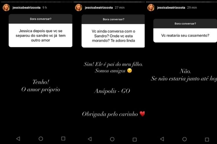 As perguntas foram respondidas através da ferramenta stories de seu perfil oficial no Instagram. Em m uma delas, ela recebeu o seguinte questionamento: “Jéssica, depois que você se separou do Sandro (Pedroso), você já tem outro amor?”, indagou a internauta. Ela respondeu: “Sim, o amor próprio”.