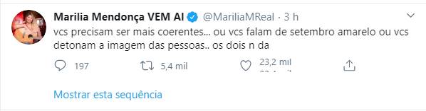 “Vocês precisam ser mais coerentes. Ou vocês falam de setembro amarelo ou vocês detonam a imagem das pessoas, os dois não dá”, escreveu ela na rede social.
