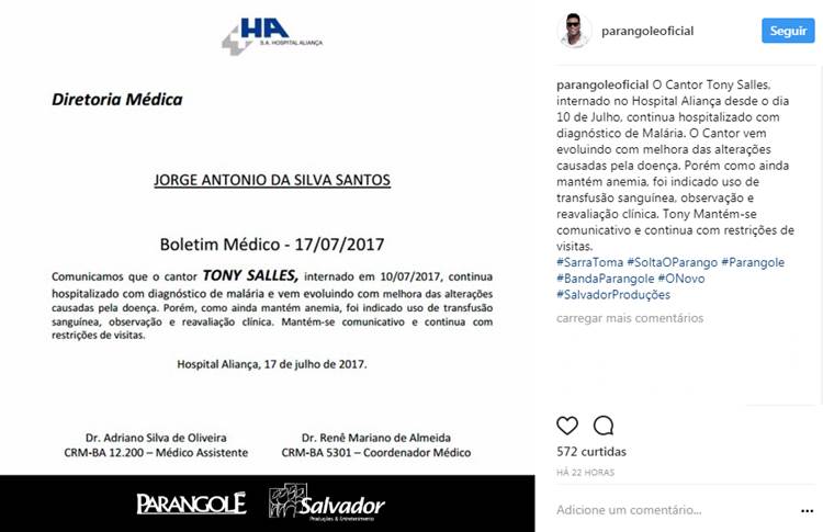 “O Cantor Tony Salles, internado no Hospital Aliança desde o dia 10 de Julho, continua hospitalizado com diagnóstico de Malária. O Cantor vem evoluindo com melhora das alterações causadas pela doença. Porém como ainda mantém anemia, foi indicado uso de transfusão sanguínea, observação e reavaliação clínica. Tony Mantém-se comunicativo e continua com restrições de visitas”.