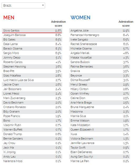 Maior comunicador do país, Silvio Santos foi nomeado a personalidade mais admirada do Brasil em 2016 segundo site britânico YouGov. No Brasil, Silvio lidera o ranking com 11,8% dos votos, 3 pontos a mais do que o segundo colocado, Joaquim Barbosa, que teve 8,8% dos votos. Bill Gates, Dalai Lama e Barack Obama completam a lista masculina das cinco pessoas mais admiradas no Brasil. A vencedora na categoria feminina foi Angelina Jolie, com 11,9% dos votos, seguida de Fernanda Montenegro, que teve 8,4%. Na pesquisa mundial, Bill Gates e Angelina Jolie encabeçam a lista com 11,3% e 9,1% dos votos respectivamente.