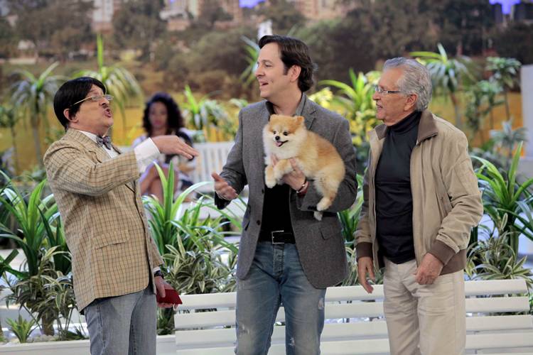 No programa deste domingo, Silvio Santos recebeu Carlos Alberto de Nóbrega e Raul Gil no quadro “Complete a Letra”.