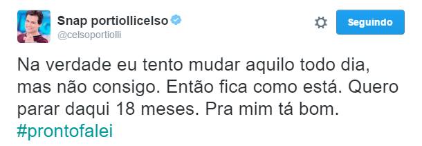 Após algumas críticas, o apresentador começou o desabafo sobre o programa e revelou que pretende parar: “Na verdade, eu tento mudar aquilo todo dia, mas não consigo. Então fica como está. Quero parar daqui 18 meses. Pra mim tá bom. #prontofalei“.