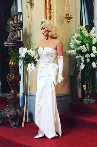 Caracterizada como Sandra, sua personagem na trama, a loira exibiu uma prévia do que acontecerá no casamento da vilã com Ernesto, interpretado por Eriberto Leão.