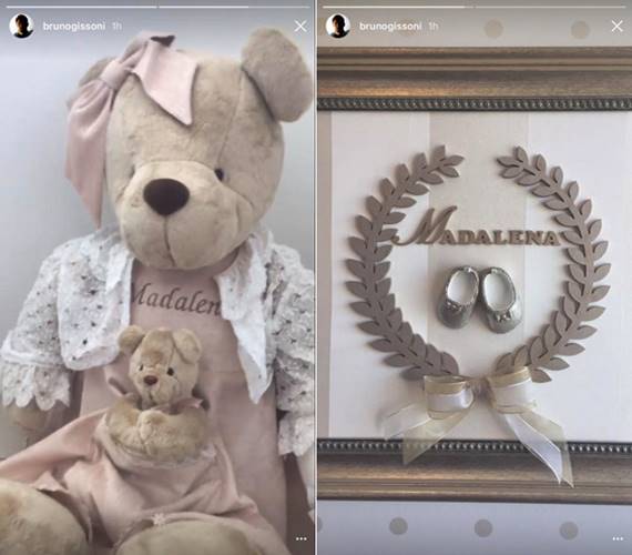 Primeiro, ele compartilhou um registro de um quadro com o nome da menina nos tons marrom e bege, em seguida, foi a vez de mostrar uma ursinha personalizado. Uma fofura!