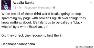 “Quando esses anormais do terceiro mundo vão parar de fazer spam com esse inglês errado falando sobre algo que não sabem? É hilário ser chamada de ‘vadia negra’ por brasileiros brancos. Eles não deveriam se preocupar com sua economia primeiro? ”, disparou a cantora.