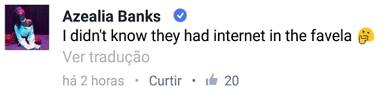 “Eu não sabia que eles tinham internet na favela”, ironizou a rapper, finalizando com a seguinte postagem: