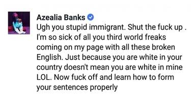 “Seus imigrantes estúpidos. Calem a boca. Estou cansada de vocês, anormais de terceiro mundo, vindo na minha página com esse péssimo inglês. Só porque vocês são brancos no seu país, não significa que sejam brancos no meu RISOS. Agora me deem licença e aprendam a formar uma frase de forma apropriada“.