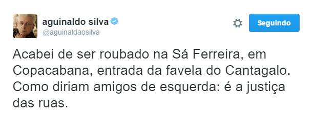 “Acabei de ser roubado na Sá Ferreira, em Copacabana, entrada da favela do Cantagalo. Como diriam amigos de esquerda: é a justiça das ruas“, escreveu ele, sem revelar detalhes.