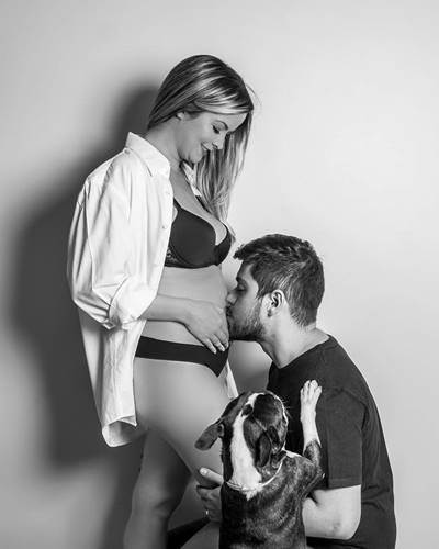A foto em preto e branco faz parte do primeiro ensaio fotográfico que o casal fez. Rodolfo aparece beijando a barriga de Maria Cecília, e até o cão de estimação dos pombinhos está no registro. Ah….o amor!
