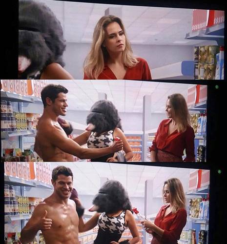 A discussão prossegue, até que as duas são interrompidas pela chegada de Henrique (Nando Rodrigues). Ele entra no camarim acompanhado de Adônis (José Loreto), que já está sem camisa para gravar o comercial. “Meninas, deixa eu apresentar o modelo que vai atuar com vocês… Esse é o Adônis”, apresenta o publicitário. “E aí? De boa?”, cumprimenta ele, tímido.