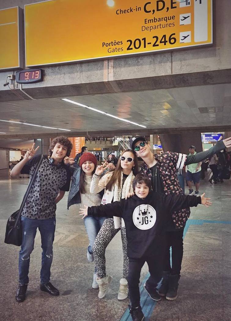 Larissa Manoela, que vive as gêmeas Manuela e Isabela, João Guilherme (Joaquim), Bia Jordão (Júlia), Kevin Vecchiato (Felipe) e Gabriel Moura (Benjamin), compartilharam um click no Aeroporto Internacional de Guarulhos.