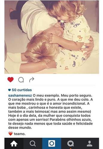 “O meu exemplo. Meu porto seguro. O coração mais lindo e puro. A que me deu colo. A que me mostrou o que é o amor incondicional. A mais boba, carinhosa e honesta que existe. Também a mais teimosa (mas amo assim mesmo). Hoje é o dia dela, da mulher que conquista todos com apenas um sorriso! Parabéns, olhinhos azuis. Te desejo nada menos que toda saúde e felicidade desse mundo. Te amo“, escreveu Sasha na legenda da imagem, onde a apresentadora da Record aparece no colo da filha ainda criança.