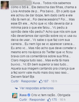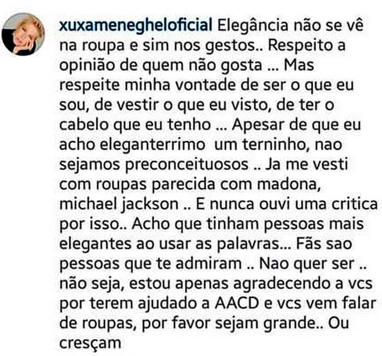 Xuxa respondeu a crítica: “Me respeita. Só isso. Quem é fã respeita e quem não é, critica. Fã gosta do que vê, não do que gostaria de ver”.