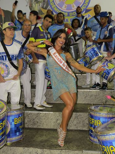 Já coroada, Aline foi para a frente da ‘Bateria do Zaca’, que possui no comando o Mestre Guma Sena, reverenciou desejando boa sorte aos ritmistas e foi sambar no meio da bateria, mostrando que tem samba no pé.