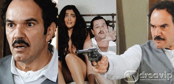 Depois que Zarolha (Leona Cavalli) contou a Nacib (Humberto Martins) que Gabriela (Juliana Paes) e Tonico (Marcelo Serrado) estão de chamego dentro da casa do sírio, o dono do Vesúvio não pensa duas vezes antes de agir: pega o revólver que tem sob a caixa registradora e sai desembestado em direção à casa.
