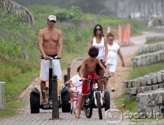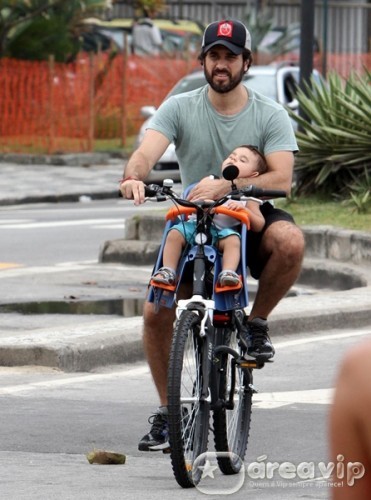 Eriberto Leão foi clicado andando de bicicleta com o filho, João, em Ipanema, no Rio de Janeiro, no domingo (12). O garoto pegou no sono e ficou apoiado no braço do pai durante o passeio.