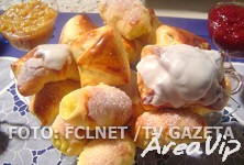 Coloque em assadeira retangular untada e polvilhada. Pincele com a gema de ovo. Deixe dobrar de volume. Leve ao forno pré-aquecido (150ºC) por aproximadamente 15 minutos. Depois, deixe no forno a 180ºC por mais 10 minutos (até dourar).