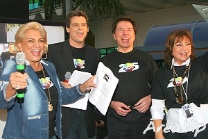 Silvio Santos faz a festa ao lado dos colegas de trabalho em comemoração dos 25 anos de SBT