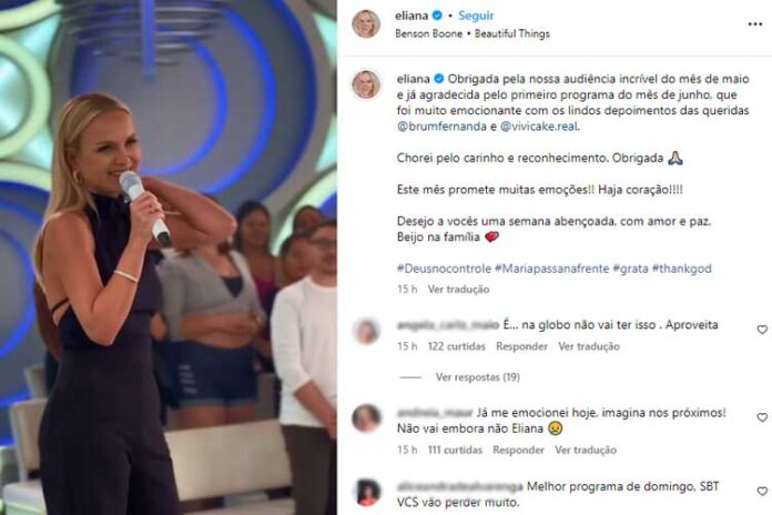 Em seguida, a cantora gospel Fernanda Brum, outra convidada do programa, também se despediu, relembrando sua trajetória ao lado da artista. “Eliana, querida! Eu tenho tanta história com você aqui. Abriu a minha vida para o Brasil, fez tantas homenagens para mim”, iniciou.