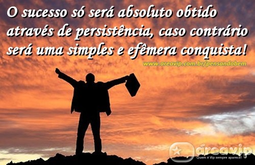 Muitas vezes na vida a gente consegue coisas de forma fácil e rápida, que não nos acrescenta em nada. Traz consigo apenas um grande vazio e nenhum aprendizado. Isto acontece pois a busca por uma grande conquista é árdua, vagarosa e amplia seus horizontes a cada passo dado. É como se a dificuldade fosse um manual de instruções para lidarmos com o Sucesso Absoluto que está por vir. Portanto: persistência, paciência e perseverança! A vitória de amanhã deve ser construída agora!