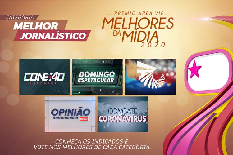 A votação do Prêmio Área VIP – Melhores da Mídia 2020 está a todo vapor. Entre as 32 categorias, que reúnem os destaques da Televisão, da Internet e Famosos do Ano, está a escolha da Melhor Jornalístico. Entre os concorrentes estão: Conexão Repórter (SBT), Domingo Espetacular (Record TV), Fantástico (Globo), Opinião no Ar (Rede TV!) e Combate ao Coronavírus (Globo). Na sua opinião, qual destes foi o melhor jornalístico de 2020? Acesse a votação e escolha o seu favorito.