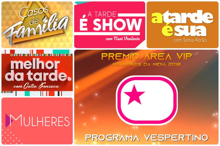 A votação do Prêmio Área VIP – Melhores da Mídia 2018 está a todo vapor. Entre as 32 categorias, que reúnem os destaques da Televisão, da Internet e Famosos do Ano, está a escolha do Melhor Programa Vespertino. Entre os concorrentes estão: A Tarde é Sua (Sonia Abrão/Rede TV!), A Tarde é Show (Nani Venâncio/RBTV), Casos de Família (Christina Rocha/SBT), Melhor da Tarde (Catia Fonseca/Band) e Mulheres (Regina Volpato/Gazeta). Na sua opinião, qual destes foi o Melhor Programa Vespertino de 2018? Acesse a votação e escolha o seu favorito.