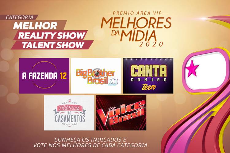 A votação do Prêmio Área VIP – Melhores da Mídia 2020 está a todo vapor. Entre as 32 categorias, que reúnem os destaques da Televisão, da Internet e Famosos do Ano, está a escolha de Melhor Reality Show/Talent Show. Entre os concorrentes estão: A Fazenda 12, BBB20, Canta Comigo Teen, Fábrica de Casamento e The Voice. Na sua opinião, qual destes foi o melhor Reality Show/Talent Show de 2020? Acesse a votação e escolha o seu favorito.