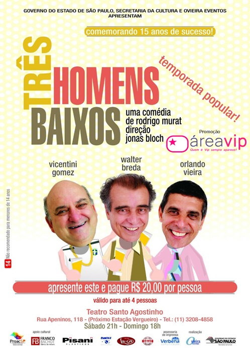 A comédia Três Homens Baixos, dirigida por Jonas Bloch, reestreou em janeiro, no Teatro Santo Agostinho, em São Paulo. O elenco é formado por Walter Breda, Vicentini Gomez e Orlando Vieira, e as sessões ocorrem aos sábados (21h) e domingos (18h), em temporada popular e com promoção do nosso Área VIP! Você vai concorrer a ingressos para conferir esta super comédia (confira as regras mais abaixo).