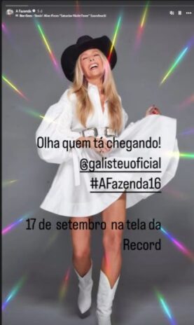 A apresentadora segue no comando do reality show rural ‘A Fazenda’, da Record. O diretor do confinamento, Rodrigo Carelli, usou as redes sociais para revelar a data de estreia, que será no dia 17 de setembro, e usou até uma foto da apresentadora descrevendo: “Ela está chegando”, disse ele na legenda, mencionando a comunicadora.
