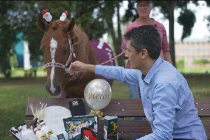 O cavalo Caramelo recebeu uma cesta de produtos veterinários de Grelo. Em contrapartida, o animal presenteou Beatriz Souza com um quadro que a retrata ao seu lado.
