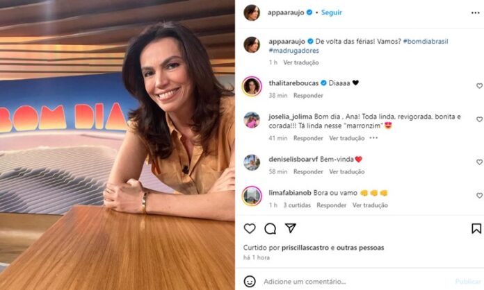 “Bom dia, Ana! Toda linda, revigorada, bonita e corada!!! Tá linda nesse ‘marronzim’“, escreveu uma fã. “Que saudade estávamos de você, que bom que voltou“, afirmou outra seguidora. “Sem você não conseguir assistir o jornal, estava com saudades, já ligando aqui“, comentou um terceiro.