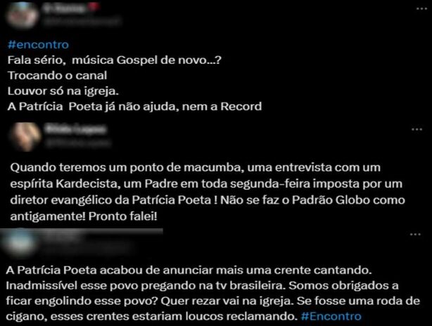 “A Patrícia Poeta acabou de anunciar mais uma cantora evangélica. Inadmissível esse povo pregando na TV brasileira. Somos obrigados a engolir isso? Quer rezar, vá à igreja”, reclamou outro usuário. “Fala sério, música gospel de novo? Trocando de canal”, opinou outro.