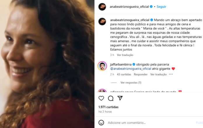 “Mando um abraço bem apertado para nosso lindo público e para meus amigos de cena e bastidores da novela Mania de você. As altas temperaturas me pegaram de surpresa nas esquinas de nossa cidade cenográfica”, escreveu ela em sua publicação.