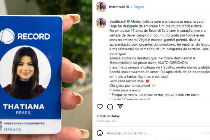 Outro nome do jornalismo da Record que deu adeus nesta terça, foi a repórter Thatiana Brasil, que estava na emissora desde 2008. Por meio do seu perfil no Instagram, Thatiana se manifestou: