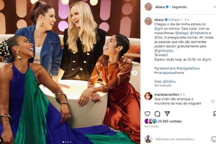 Antes, a artista já havia compartilhado fotos ao lado da suas colegas de programa. “Chegou o dia da minha estreia no @gnt no icônico “Saia Justa” com as maravilhosas @belagil, @ritabatista e @tati. A energia esta incrível. Ah, todas as pessoas que não são assinantes podem assistir gratuitamente pelo @globoplay. Tá lindo!! Espero vocês hoje, as 22:30, no @gnt”, escreveu Eliana na legenda da publicação.