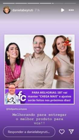Há poucos dias, Daniela explicou em entrevista a ‘Folha de SP’, o motivo pelo qual fez tantas mudanças no SBT: “Porque era necessário. Acho que a gente demorou um pouco para reagir depois da pandemia. Eu só escutava, era uma coisa que eu me irritava demais: ‘ah, porque é digital isso, digital aquilo’. Meus filhos assistem ao Luccas Neto, por exemplo. Eu assisti a todos os filmes do Luccas Neto no Netflix e também assisti ao Lucas Neto no YouTube. Daí eu comecei a pensar: o que é legal no digital? E o que as pessoas estão gostando de ver no digital? O que é a TV hoje? O que vai ser a TV do futuro? O digital nunca mais vai sair das nossas vidas, é um fato. E a TV é um fato. Acho que eles são totalmente complementares“, contou ela.