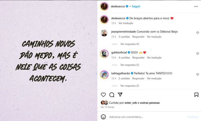 Através das redes sociais, Deborah comentou sobre novos desafios, destacando que eles dão medo, mas que são necessários para que tudo aquilo que desejamos, seja concretizado. “Caminhos novos dão medo, mas é nele que as coisas acontecem“, diz a mensagem compartilhada pela atriz nesta última segunda-feira, 28 de outubro. Ainda na legenda, ela frisou: “De braços abertos para o novo“, completou.