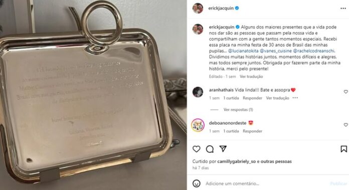 “Alguns dos maiores presentes que a vida pode nos dar são as pessoas que passam pela nossa vida e compartilham com a gente tantos momentos especiais. Recebi essa placa na minha festa de 30 anos de Brasil das minhas pupilas… @lucianatokita @vanes_cuisine @rachelcodreanschi. Dividimos muitas histórias juntos, momentos difíceis e alegres, mas todos sempre juntos. Obrigada por fazerem parte da minha história, merci pelo presente!“, publicou ele.