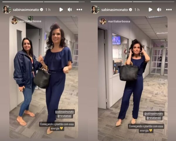 A jornalista Sabina Simonato segue substituindo Rodrigo Bocardi no comando do telejornal ‘Bom Dia SP‘, noticiário local da TV Globo São Paulo. No entanto, na madrugada desta quinta-feira, 21 de dezembro, a artista acabou tendo imagens suas nos bastidores do jornal divulgadas pelas colegas na web e, claro, a própria não deixou de compartilhá-las.