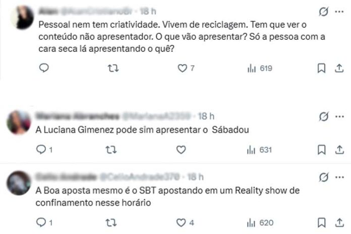 “Luciana Gimenez pode sim apresentar o ‘Sabadou’”, concordou outra. “Seria um sucesso”, afirmou outro. Outra, disse que é preciso renovar, colocando alguém novo no posto de Virginia. “Pessoal nem tem criatividade. Vivem de reciclagem. Tem que ver o conteúdo não apresentador. O que vão apresentar? Só a pessoa com a cara seca lá apresentando o quê?”, afirmou.