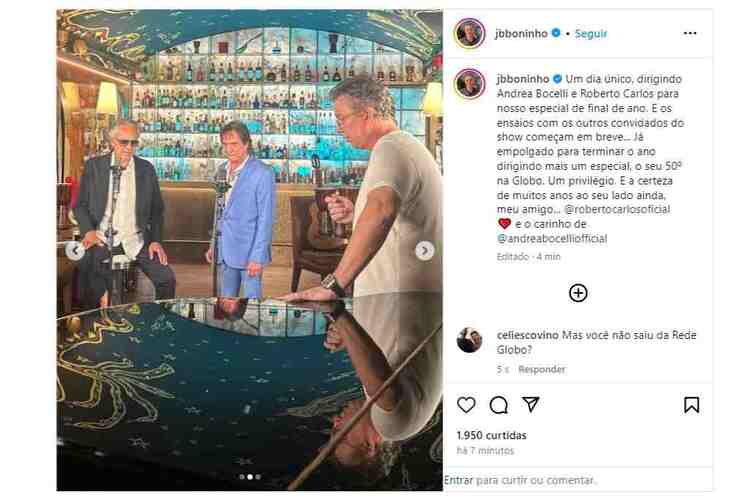 “Um dia único, dirigindo Andrea Bocelli e Roberto Carlos para nosso especial de final de ano. E os ensaios com os outros convidados do show começam em breve… Já empolgado para terminar o ano dirigindo mais um especial, o seu 50º na Globo. Um privilégio”, celebrou o diretor.