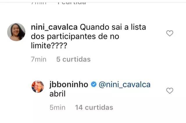 Boninho revelou em que mês será divulgada a lista de participantes da nova edição de “No limite“. Antes de tudo, vale lembrar que o reality terá a presença mais que confirmada de ex-BBB’s competindo pelo prêmio principal. Sendo assim, nas redes sociais, o diretor de entretenimento da Rede Globo respondeu a uma fã que o público conhecerá os participantes do programa em abril. Além disso, está confirmado que a atração será apresentada por André Marques.