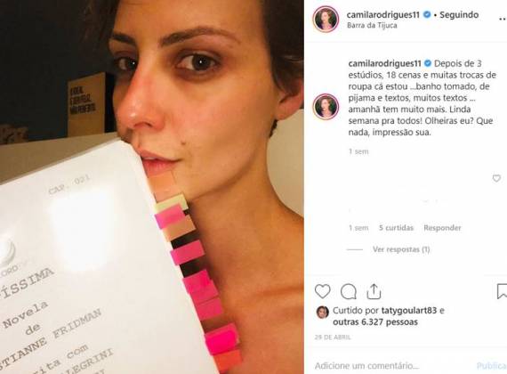 No final de Abril, Camila Rodrigues postou em seu Instagram, um click com o texto na mão e disse: “Depois de 3 estúdios, 18 cenas e muitas trocas de roupa cá estou …banho tomado, de pijama e textos, muitos textos … amanhã tem muito mais. Linda semana pra todos! Olheiras eu? Que nada, impressão sua“.
