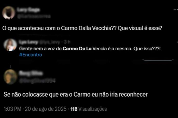 Em redes como o X (antigo Twitter) vários internautas reagiram à mudança de visual. “O que aconteceu com o Carmo Dalla Vecchia?? Que visual é esse?”, perguntou uma internauta. “É ele mesmo?”, perguntou mais uma impressionada.