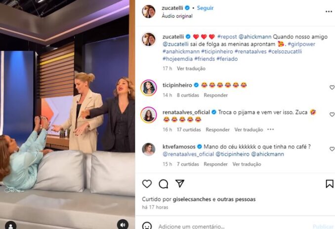 Na oportunidade, Ana comentou que o amigo estava de folga e, em seguida, elas se jogaram de ponta cabeça no sofá do matinal, levando ele a reagir ao momento no feed do Instagram. Nos comentários da publicação, elas reagiram: “Troca o pijama e vem ver isso, Zuca“, brincou Tici. “Quando nosso amigo @zucatelli sai de folga as meninas aprontam“, disse Ana. Renata usou emojis de risos.