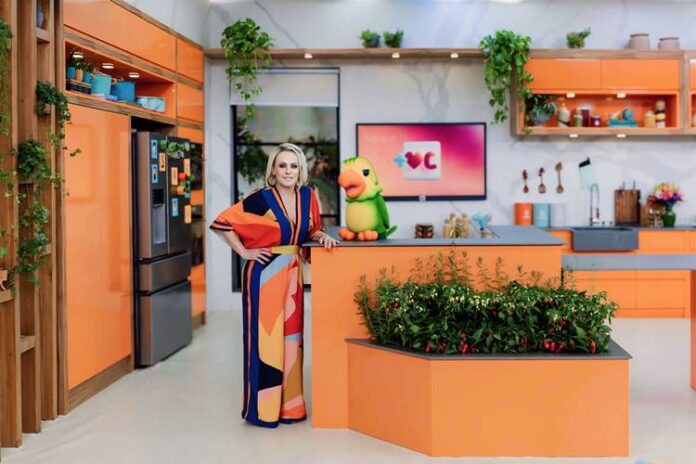 No cenário, cores vibrantes receberam a apresentadora. “Estávamos com a mesma cozinha há dois anos, e sentíamos que precisávamos renovar o espaço para o nosso público. Sempre nos mantemos antenados à tendências de decoração para escolher materiais, revestimentos e cores. Optamos pelo cenoura, seguindo as variações de tons em voga neste ano”, explica a diretora geral do ‘Mais Você’, Viviane De Marco. Liliane Chagas, cenógrafa responsável, acrescenta: “Buscamos sempre inserir cores quentes na cozinha, e a cor do ano casou com a nossa proposta. O laranja é bastante interessante nesse tipo de ambiente porque é cheio de energia e instiga criatividade”.