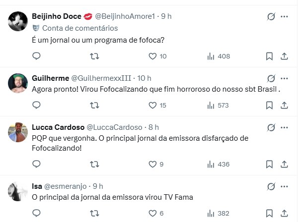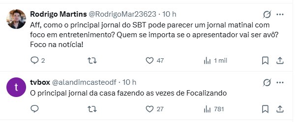 A notícia, claro, emocionou uns, mas foi vista como inadequada para o noticiário: “Aff, como o principal jornal do SBT pode parecer um jornal matinal com foco em entretenimento? Quem se importa se o apresentador vai ser avô? Foco na notícia!“, disparou um. “O SBT Brasil já foi interessante, parei de assistir a meses“, comentou mais um. “É um jornal ou um programa de fofoca?“, quis saber outro.