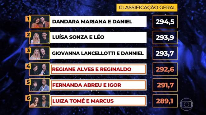 Fernanda Abreu, Giovanna Lancellotti, Dandara Mariana, Luíza Tomé, Luísa Sonza e Regiane Alves dançaram o Baladão Sertanejo, e foram definido as três finalistas e as três participantes que vão para a repescagem.