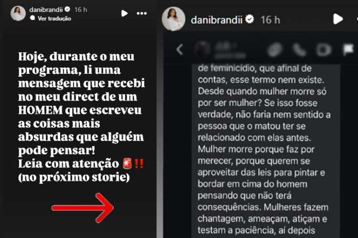 De acordo com a jornalista, o responsável pelo texto “escreveu coisas absurdas” com ofensas e comentários deslegitimando a importância do combate ao feminicídio. “Hoje, durante o meu programa, li uma mensagem que recebi no meu direct de um homem que escreveu as coisas mais absurdas que alguém pode pensar! Leia com atenção!”, informou.